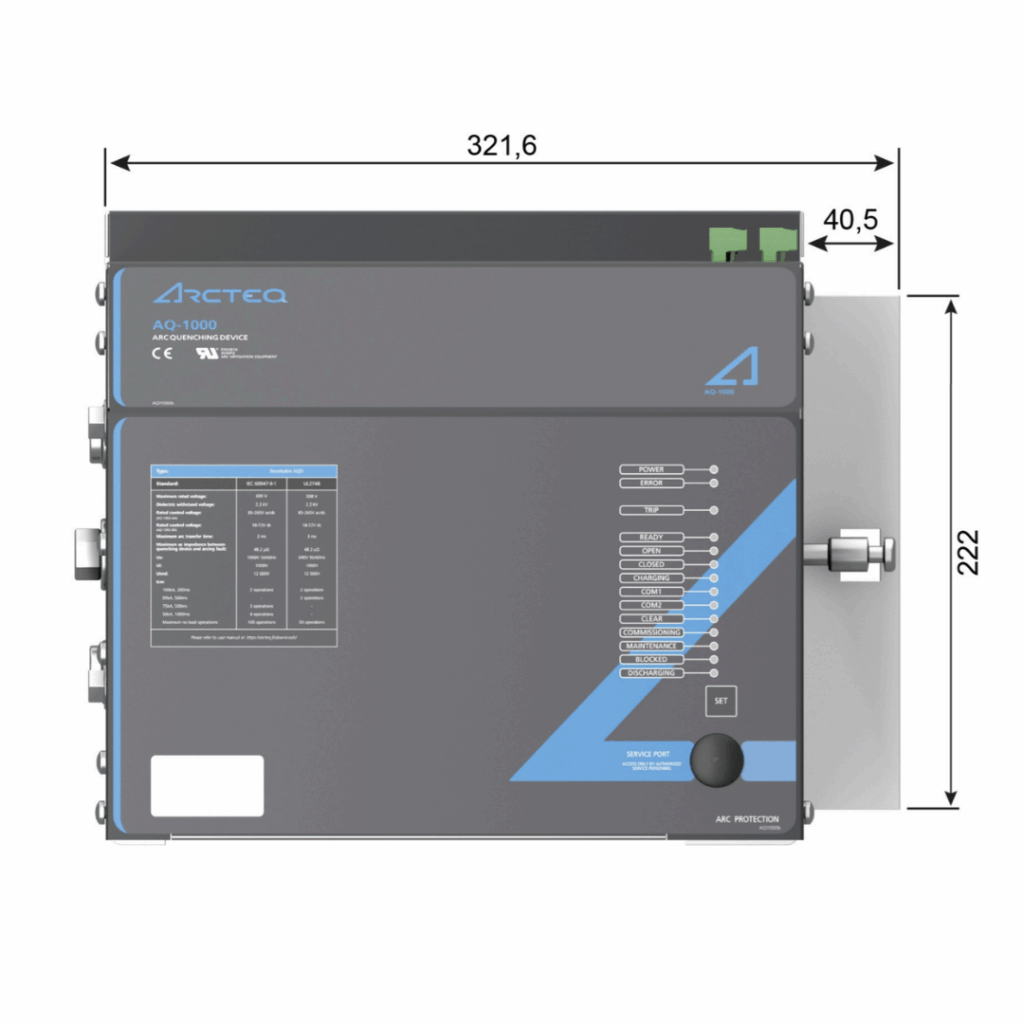 AQ-1000 is used together with the AQ-100 arc protection system. When an AQ-100 series relay detects an arc fault, it simultaneously trips the circuit-breaker(s) feeding the fault and triggers the AQ-1000 arc quenching device. AQ-1000 then creates a low-impedance parallel path for the fault current, rapidly collapsing the arc. The total arcing time of the system is less than 4 milliseconds.
